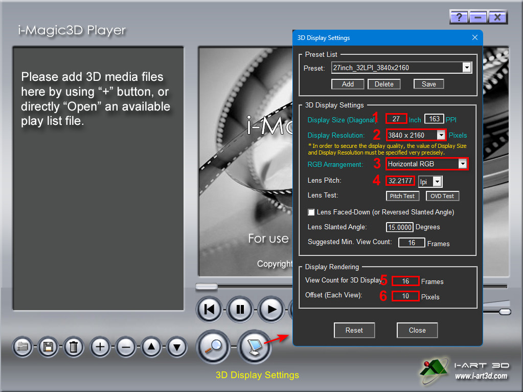 Simply enter the size and resolution of your LCD/OLED display panel (monitor, laptop) and the LPI value of the 3D lenticular lens, and i-Magic3D Player will automatically complete all the complex engineering calculations and rendering processes, allowing you to focus on creative presentation!